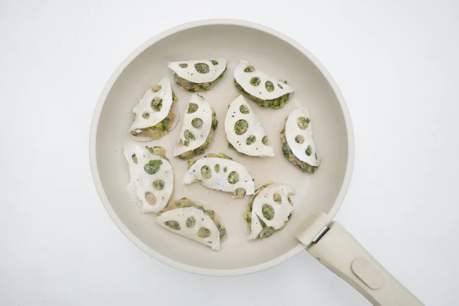 スライサーがなく、薄切りが難しい場合には、なるべく薄く切ったれんこん2枚でタネを挟んでも美味しくできあがりますよ。その際は、蓮根の厚さに合わせて加熱時間を調整してくださいね。