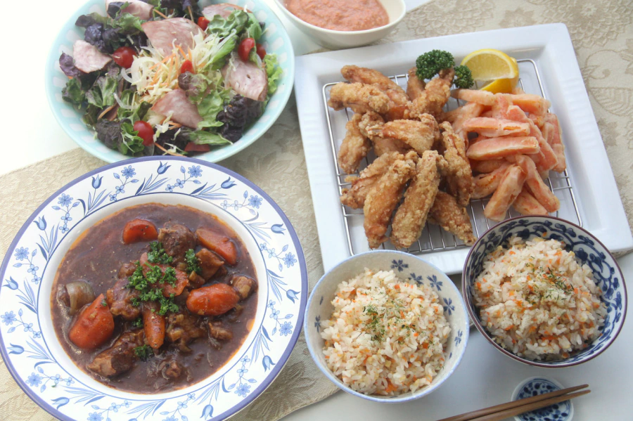 人参ご飯、ビーフシチュー、唐揚げ、キャロットドレッシングと、これだけマスターすれば、1日の献立も出来上がります。