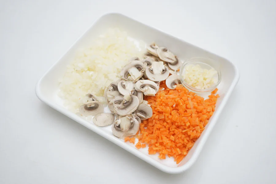 玉ねぎ、人参を基本にお好みのきのこやお野菜に変更可能です。みじん切りにして入れてみてくださいね。