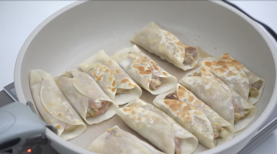 手作り餃子で手間に感じる作業は、ひだを作って包む作業かもしれませんね。今回は棒餃子なので、餃子の皮に餡をのせて、皮を畳むだけでOK!お子さんとも楽しく作ることができますよ。